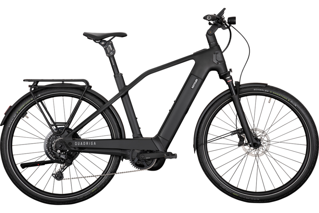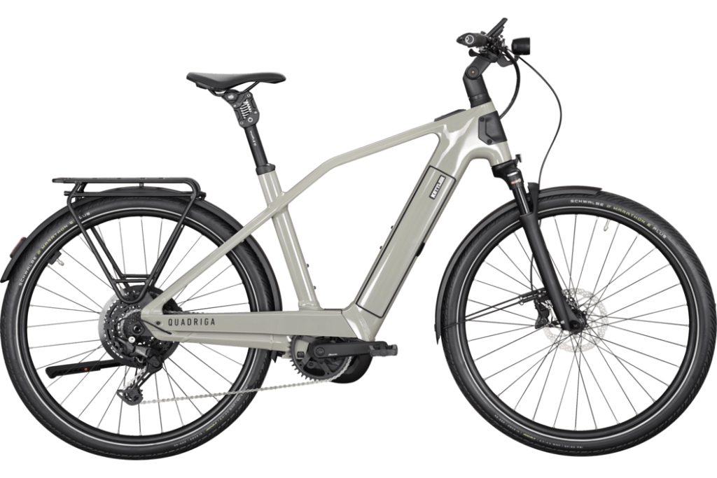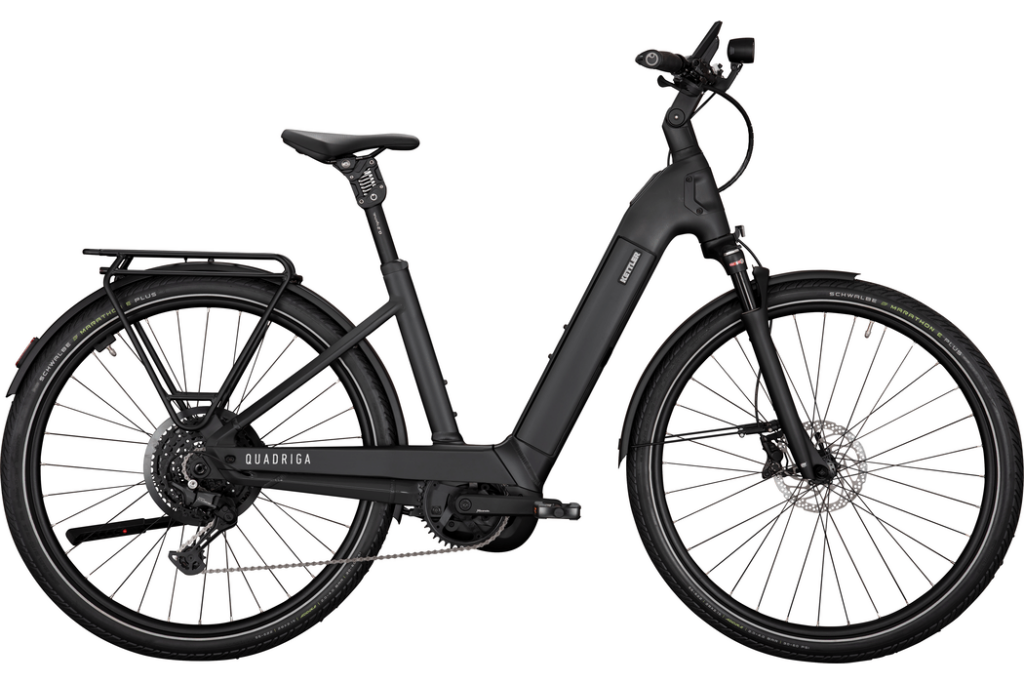 Le nouveau QUADRIGA CX10 offre une combinaison impressionnante de technologie innovante et de pièces rapportées de haute qualité. Le nouveau moteur Performance Line CX assure une conduite particulièrement harmonieuse grâce à des capteurs optimisés et à une réduction supplémentaire du bruit, tandis que la géométrie améliorée du cadre et le carter de chaîne en aluminium sont synonymes de confort et de longévité. Avec le montage optionnel du panier avant et le logo éclairé, le QUADRIGA CX10 pose de nouveaux jalons en matière de design et de fonctionnalité. L'accès bas et large facilite la montée et la descente lors des stop-and-go quotidiens en ville. La surface particulièrement grande de l'écran Bosch Kiox 500 affiche clairement les informations importantes comme l'état de la batterie, l'autonomie ou la vitesse. Les boutons plus grands améliorent considérablement l'utilisation. C'est justement sur les routes accidentées ou les chemins de gravier que la fourche à suspension pneumatique Suntour et la tige de suspension en parallélogramme de by.schulz assurent un grand confort de conduite. Pour plus de stabilité lors du stationnement du vélo électrique, une béquille à deux pieds peut être montée. Le chargement et le déchargement du vélo sont ainsi plus faciles et plus sûrs. Le logement intégré dans le cadre pour un module GPS à monter ultérieurement améliore la protection contre le vol grâce au tracking. Le QUADRIGA CX10 est un choix sûr et confortable pour une utilisation quotidienne.