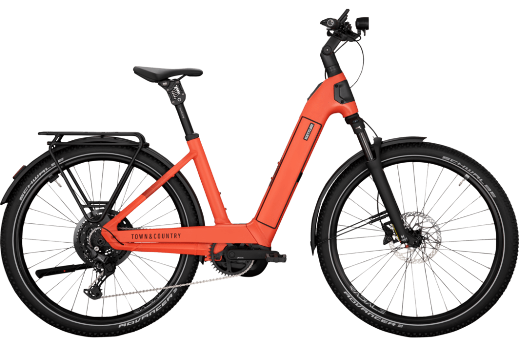 Le point fort du TOWN & COUNTRY CX10 est le carter de chaîne en aluminium : non seulement il protège l'entraînement de la saleté et de l'humidité, mais il assure également un aspect propre grâce à sa résistance à la corrosion et réduit en outre les besoins d'entretien. La batterie intégrée dans le tube diagonal contribue à un design fin et épuré. Le logo éclairé n'est pas seulement un élément esthétique, il augmente également la sécurité en rendant le vélo électrique plus visible dans la circulation. La possibilité de monter un panier avant - avec une charge maximale d'environ 10 kg - offre un confort supplémentaire pour l'utilisation quotidienne. Le moteur Bosch Performance Line CX de dernière génération avec un couple de 85 Nm et une puissance maximale de 600 W offre une assistance puissante et efficace sur tous les parcours. Les nouvelles batteries PowerTube, au choix de 600 ou 800 Wh, offrent encore plus d'autonomie et de flexibilité. Grâce à la géométrie optimisée du cadre, qui assure une conduite ergonomique et stable - en particulier dans les virages ou à des vitesses élevées - chaque trajet devient un plaisir.
